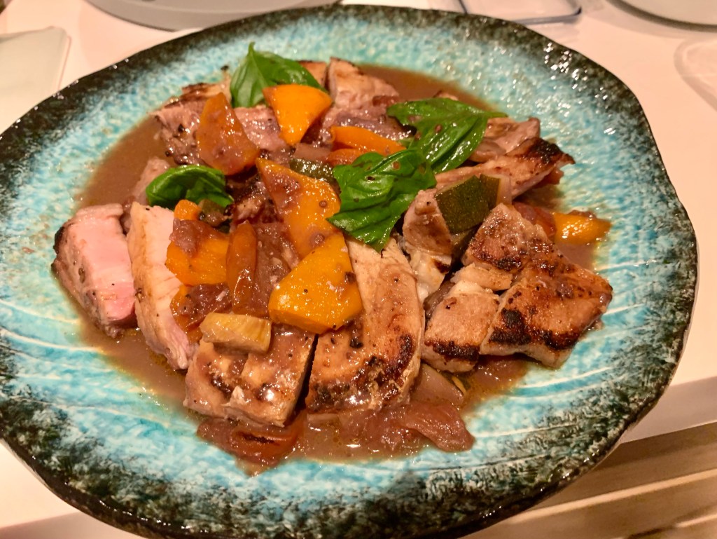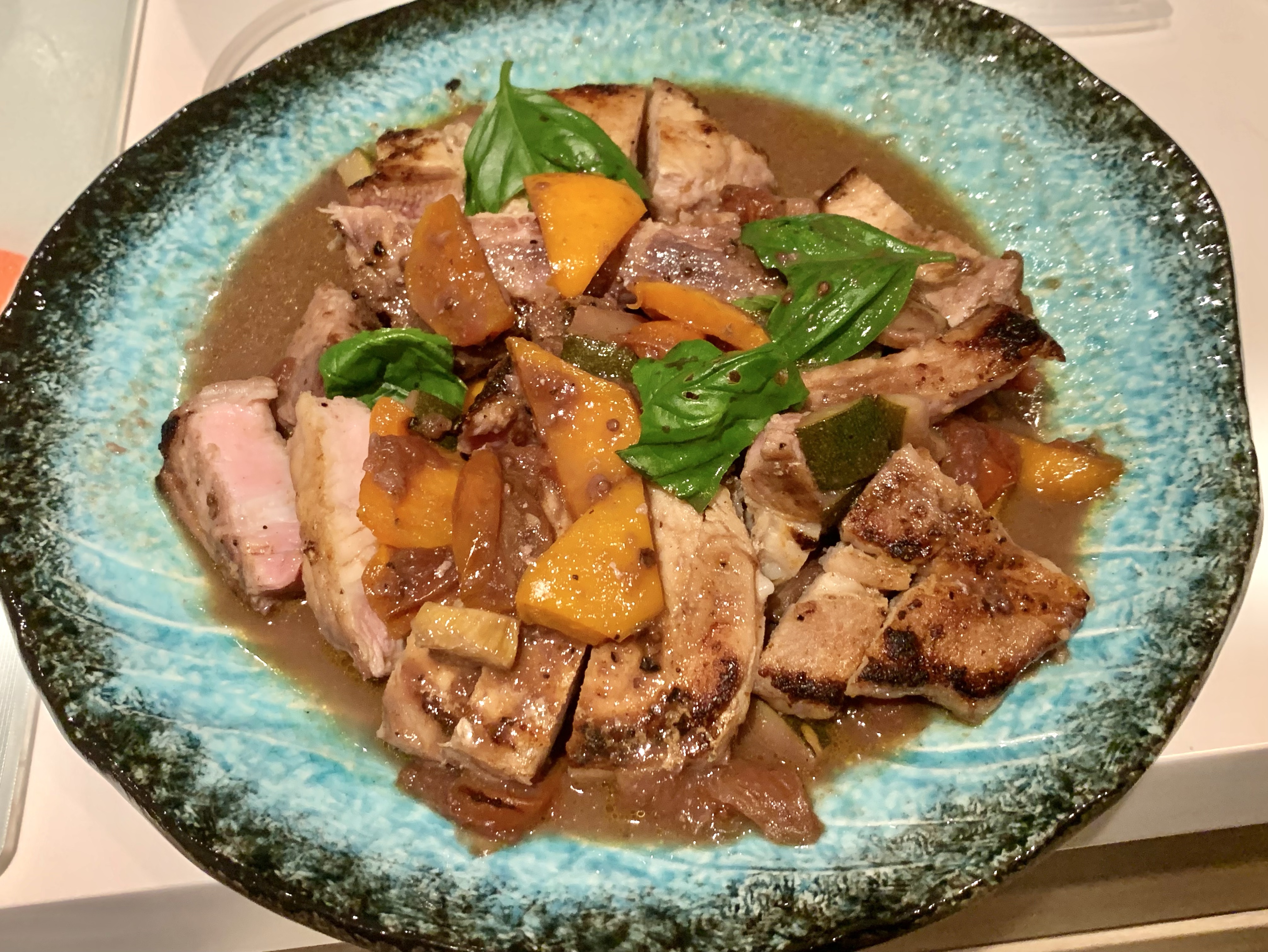 sous vide Australian pork chop in red wine tomatoes ratatouille