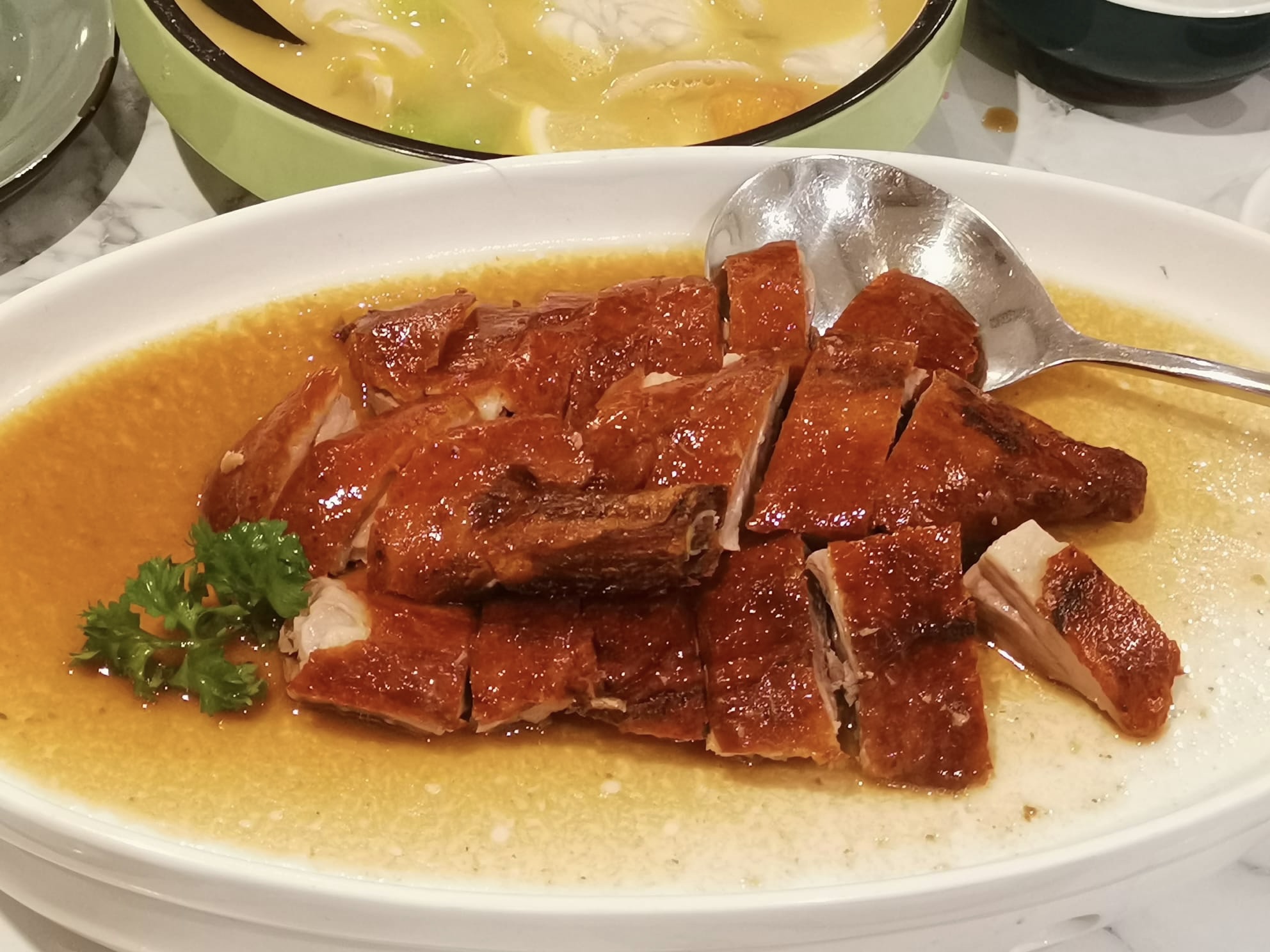took 4pax $78 lunch set which included 2 appetisers cloud fungus and spring rolls, 1/2 roast duck, soup of the day, salted vegetables sliced snakehead soup, and dessert.
