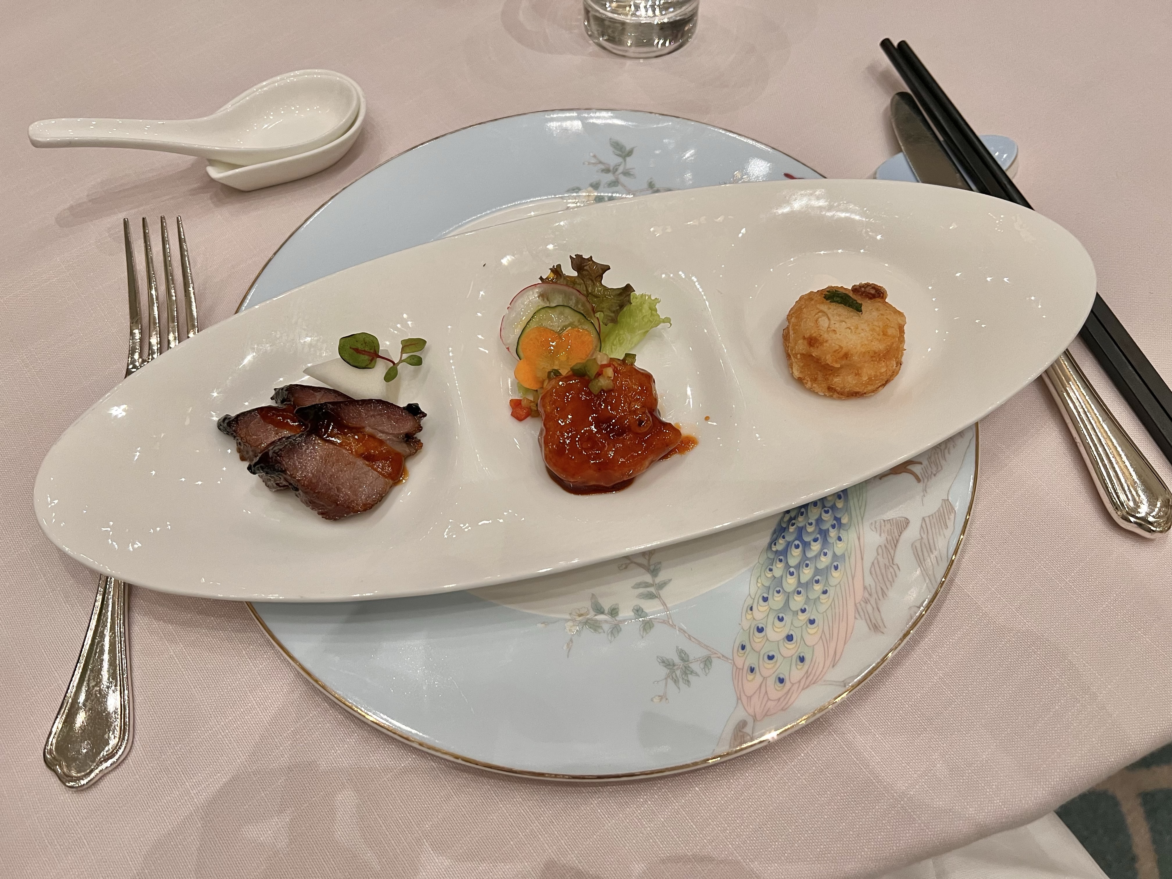 appetiser trio- prawn sweet sour sauce a bit sweet..batter a bit hard than crisp..battered scallop slight overcooked not moist, char siew flavourful texture a bit old the leaner type some fat