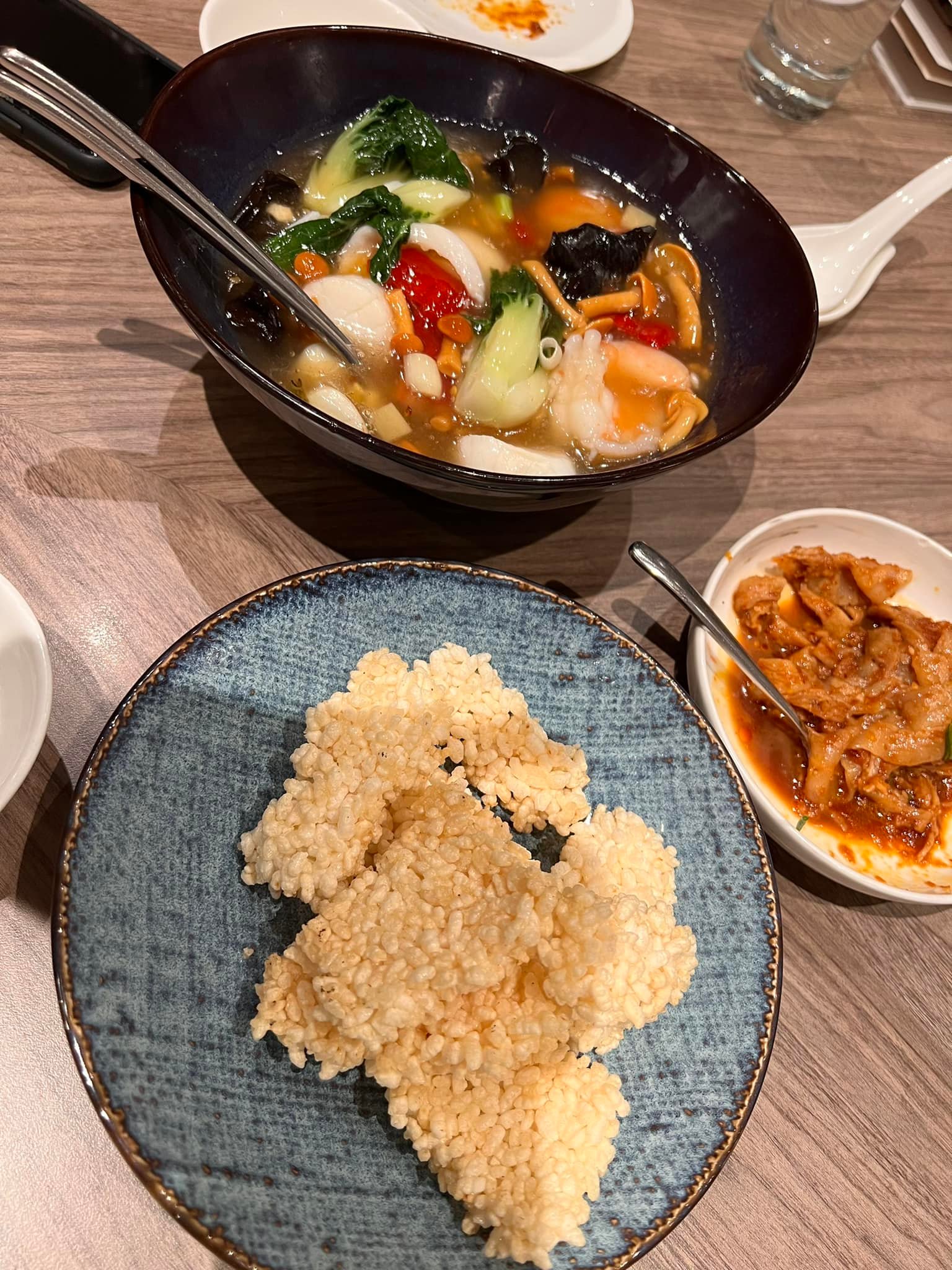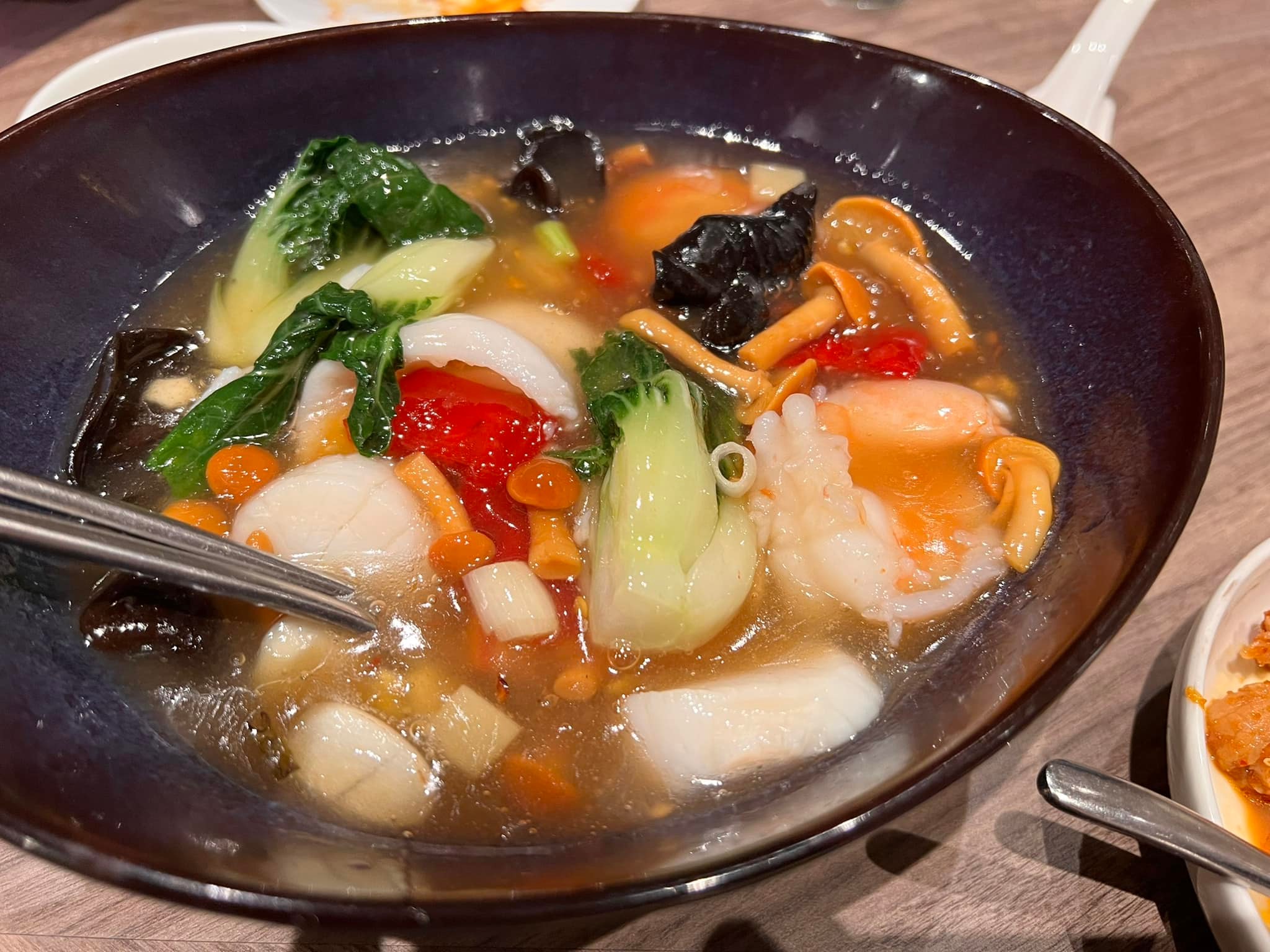 the seafood crispy puff rice 锅巴had great ingredients- 3 huge prawns 3 scallops & several sliced fish ..this style of preparation not my favourite though..thin gluey very sweet soup ..I prefer tasty stock …& everything including vegetables seem to be soaked with sugar..