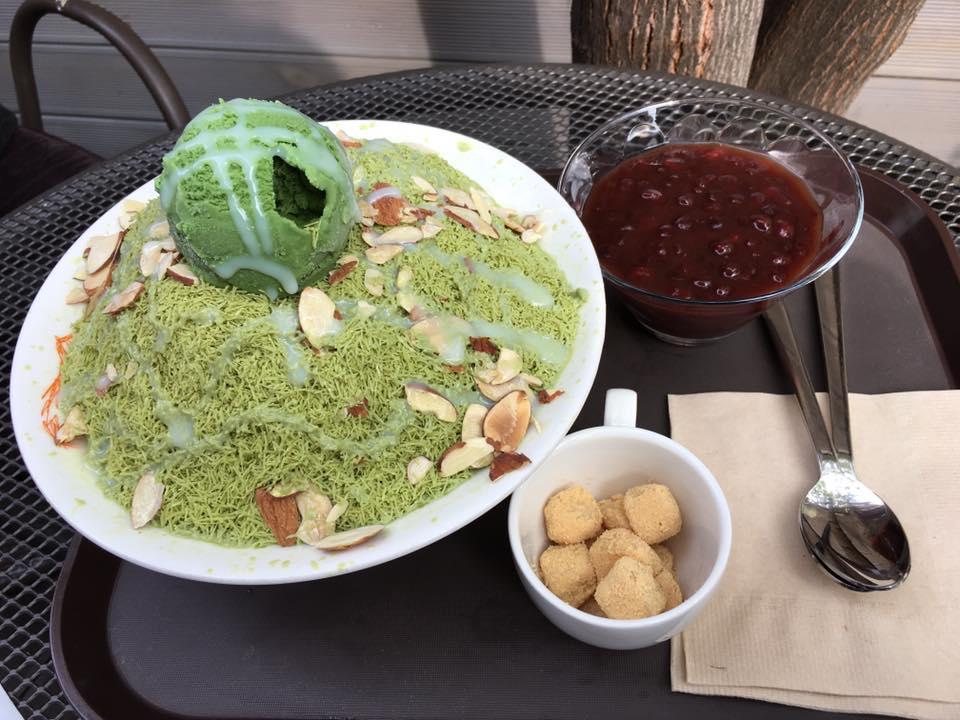 it came with almond flakes, red beans, green tea ice cream, green tea bingsu shavings, and some mocha.