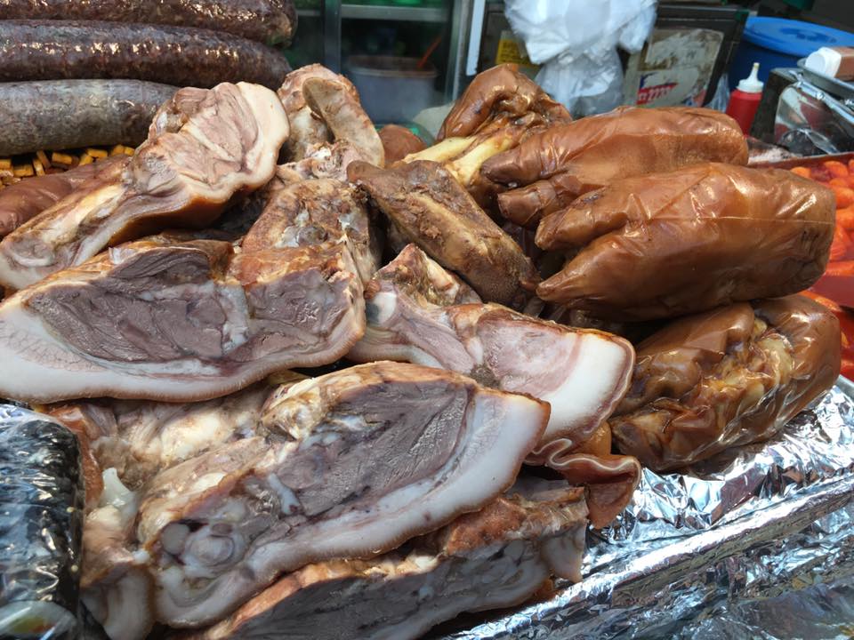 I don’t like blood sausage myself. head cheese & what looked like birth intestines (fallopian tubes) were too much for my wife, but she was game for some jogbal (trotters).