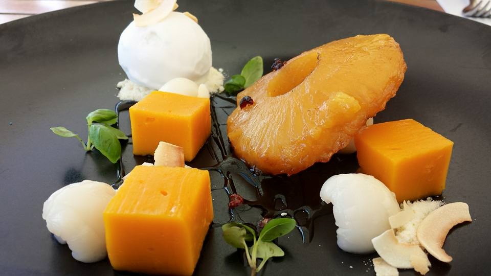 my wife ordered the tipsy cake. according to the server this was the most difficult dessert to make as the pastor chef had to manage the temperature & to add liquor to the brioche at specified intervals. the roasted pineapples was the easy part.