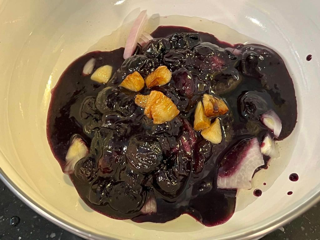 5 flamed sous vide belly pork with blueberry reduction