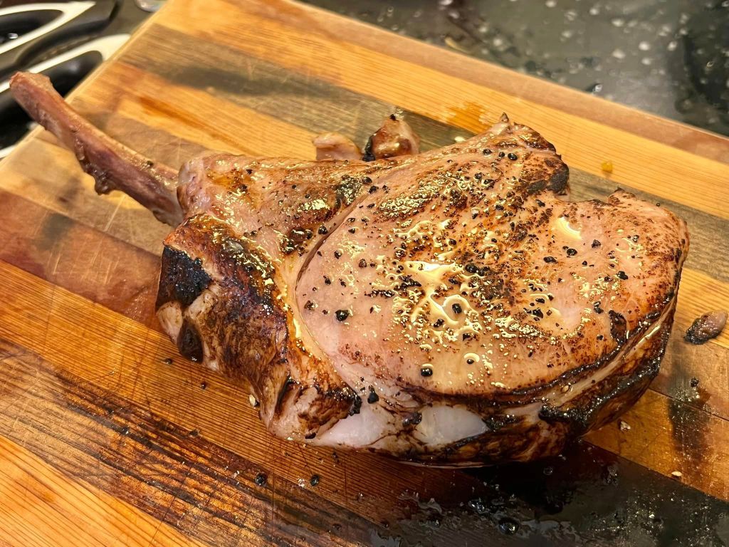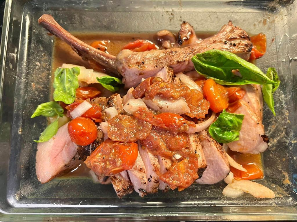 6 flamed sous vide pork tomahawk with red wine tomatoes salsa