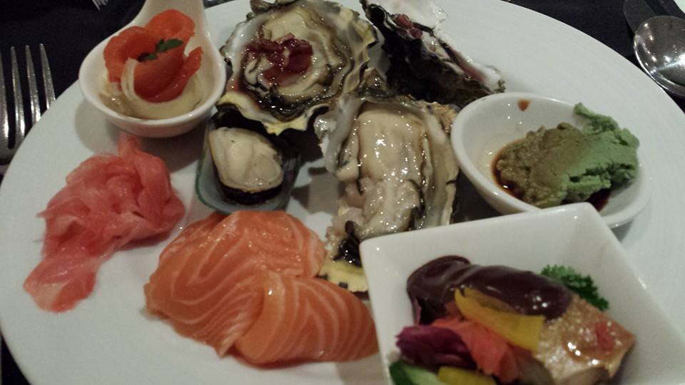 cold appetizers – oysters, mussels, scallops on shell, salmon, maguro & tai sashimi, prawns & some sushi